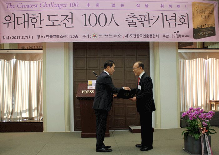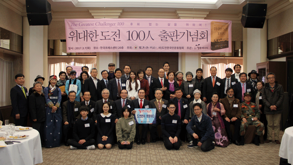‘위대한 도전 100人’의 저자인 도전한국인본부는 일상의 삶 속에서 크고 작은 도전을 해 나가는 한국인들과 세계 속에서 끝없이 도전해 온 도전자들을 발굴하여 시상하는 등 한국인의 도전정신 함양과 확산을 목표로 설립된 비영리 민간단체이며, 지금까지 도전한국인상 수상자는 반기문 UN사무총장, 신호범 미국 워싱턴주 상원부의장, 야구선수 박찬호, 김용 세계은행총재, 가수 싸이, 역도선수 장미란, 호사카 유지 세종대 교수, 박동우 미국 백악관 정책위원, 방송인 송해, 가수 김상희, 탐험가 최종열, 배우 최불암, 최수종, 체육인 황영조, 허영호, 홍수환, 이돈희 아버지날·노인의 날·세계어버이날 만든 이 등 다수이다.