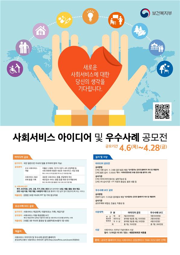 보건복지부(장관 정진엽)는 4월 6일부터 4월 28일까지「사회서비스 아이디어 및 우수사례 공모전」을 개최한다.
