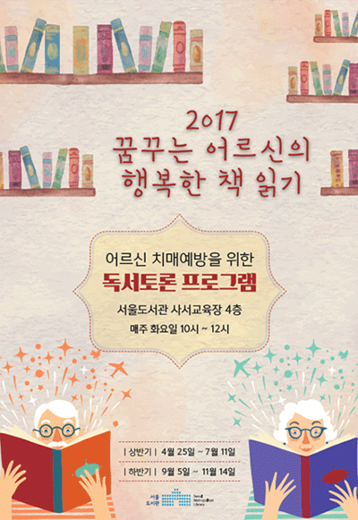 서울도서관은 어르신 치매 예방을 위해 ‘2017 꿈꾸는 어르신의 행복한 책 읽기’ 프로그램을 오는 25일부터 진행한다고 밝혔다.