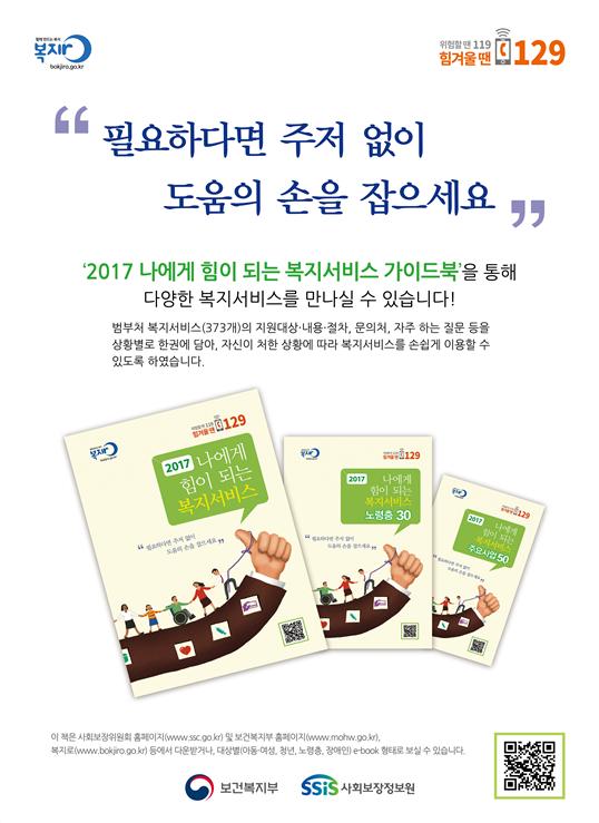 보건복지부는 국민의 입장에서 쉽게 이해할 수 있도록 여러 부처에 흩어져 있는 복지서비스(373개)를 한 권에 담은 ‘2017 나에게 힘이 되는 복지서비스’를 개정 발간했다.