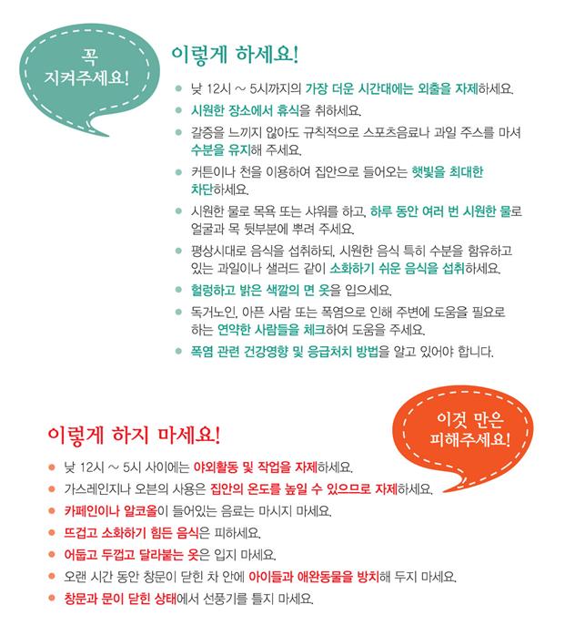 폭염주의보, 경보 등이 발령되면 가능한 위험시간(12시∼17시) 활동은 줄이도록 하며, 활동이 불가피한 경우 챙 넓은 모자, 밝고 헐렁한 옷 등을 착용하면 폭염예방에 도움이 될 수 있다.