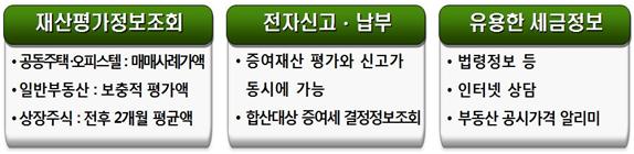 ‘전자신고·납부’ 항목에서는 상속·증여재산 평가정보 조회를 통해 확인된 증여재산 가액으로 바로 증여세 전자신고와 납부를 할 수 있도록 하였으며, ‘유용한 세금정보’ 항목에서는 납세자 눈높이에 맞춘 다양한 재산 평가와 관련된 정보를 제공하기 위해,「국세법령정보시스템」을 연계하여 세법과 판례·예규 등 다양한 해석 사례를 찾아볼 수 있도록 하였고, 국세상담센터에 인터넷 상담신청이 가능하도록 했다.