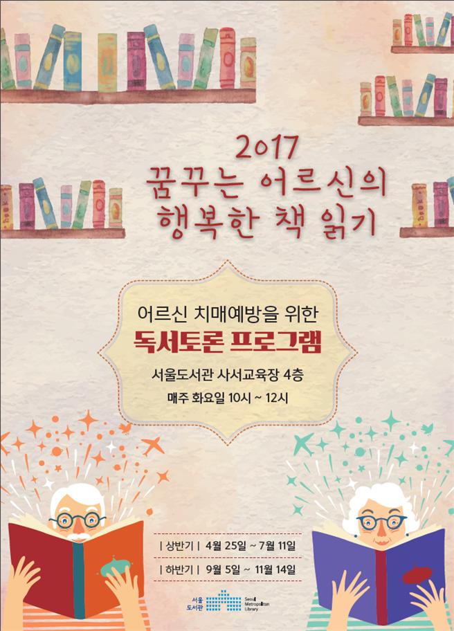 65세 이상 어르신을 대상으로 운영 중인 『꿈꾸는 어르신의 행복한 책 읽기』는 어르신들의 치매예방을 위한 독서토론 프로그램이다. 오는 9월 5일(화)부터 시작되는 하반기 프로그램은 지난 상반기에 진행된 ‘인생책수다(人生冊秀多)-책과 함께 하는 보람찬 삶’ 강좌의 심화 과정으로 ‘인생시모작(人生詩毛作)-시로 엮어내는 내 인생 스토리텔링’을 주제로 총 10차례에 걸쳐 시를 함께 낭독하고 창작 활동을 해 볼 수 있다.