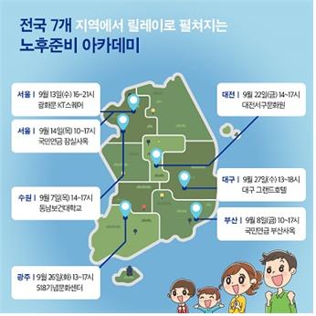 국민연금공단(이사장 직무대행 이원희)은 창립 30주년을 맞아 9월 7일부터 27일까지 5060세대인 신중년과 함께하는 ‘노후준비 아카데미’를 전국 순회 형식으로 개최한다고 밝혔다.