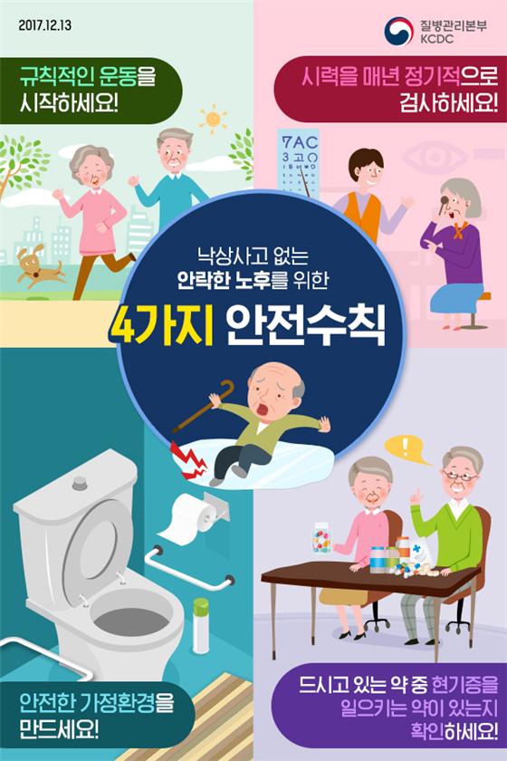 질병관리본부(본부장 정은경)는 겨울철을 맞아 어르신들이 미끄러져 넘어지는 낙상*사고 예방을 위해 준수사항과 대처방법을 안내하였다.
