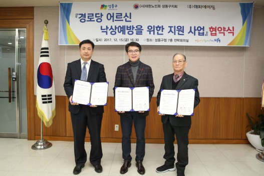 성동구(구청장 정원오)는 대한노인회 성동구지회(지회장 임인수), (주)해피에이징(대표 권경혁)과 ‘경로당 어르신 낙상예방 지원사업’협약을 체결했다.