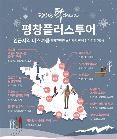 경기관람 전·후일을 활용해 당일치기로 강원도를 조금 더 즐길 수 있는 ‘인근지역 버스여행’도 있다. 북강릉수송몰과 진부수송몰(KTX진부역)에서 출발하는 ▲속초 도자기체험 투어 ▲횡성 한우먹고 서바이벌 체험 투어 ▲동해 겨울바다 대게 먹방 투어 ▲원주 분식 먹방투어 ▲삼척 바다위, 바다옆 투어 ▲인제 뽀드득 겨울자작나무숲 트래킹 투어 ▲양양 낙산 투어 ▲홍천 화로구이·찜질방 투어 ▲고성 비무장지대(DMZ) 투어 ▲태백 태양의후예 투어, ▲영월 지붕없는 박물관 투어 등 11개 ‘평창 플러스 투어’ 프로그램을 경기 관람객이라면 누구나 1만 원에 즐길 수 있다.