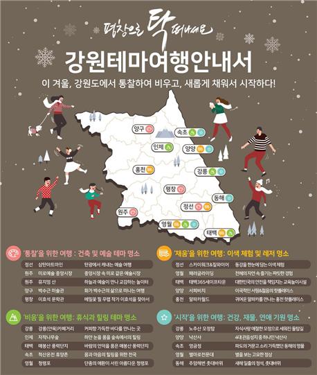 ‘강원테마여행안내서’는 ‘이 겨울, 통찰하여 비우고, 새롭게 채워 시작하다’를 주제로 4가지 테마 ▲(통찰) 건축 및 예술, ▲(비움) 휴식과 힐링(치유), ▲(채움) 이색 체험 및 레저, ▲(시작) 건강, 재물, 연애 기원에 맞는 여행명소 20곳을 소개한다. 통찰과 비움 테마 여행은 올림픽 기간 동안에, 채움과 시작 테마여행은 패럴림픽 기간 동안에 진행되며 1만 원으로 ‘맛보기 여행’도 즐길 수 있다.