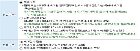 * 이사한 세대원을 선택하고, 이사한 곳의 세대주 변경 여부에 따라 편입, 합가 등 구분이 자동 결정