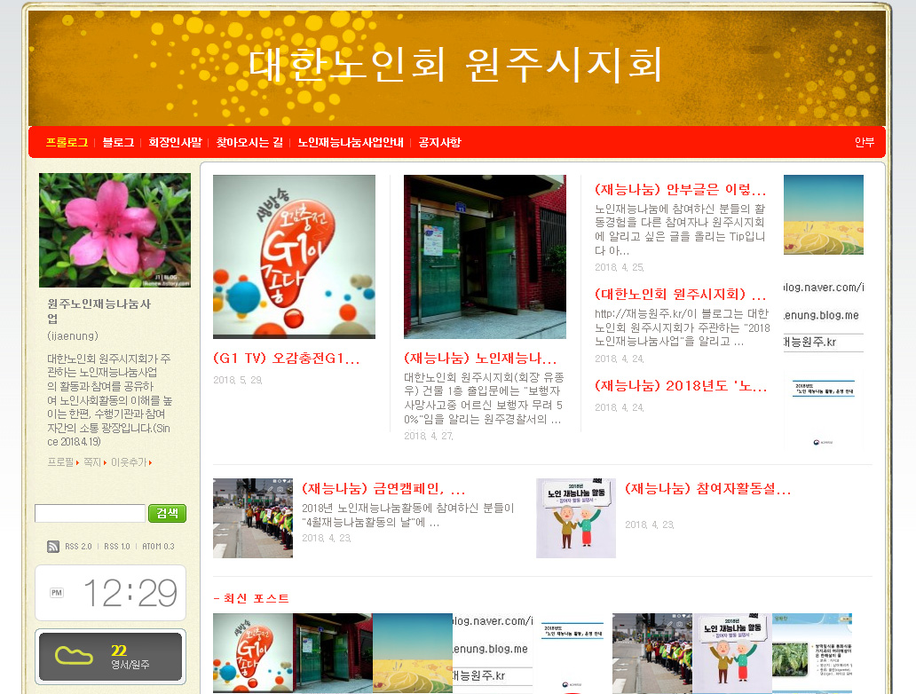 강원도 원주시지회(지회장 유종우)에서는 재능 나눔 활동 참여자와의 정보를 공유하여 노인사회활동의 이해도를 높이는 한편, 수행기관과 참여자 간의 원활한 소통을 위하여 재능 나눔 활동 블로그를 설치, 운영하고 있다.