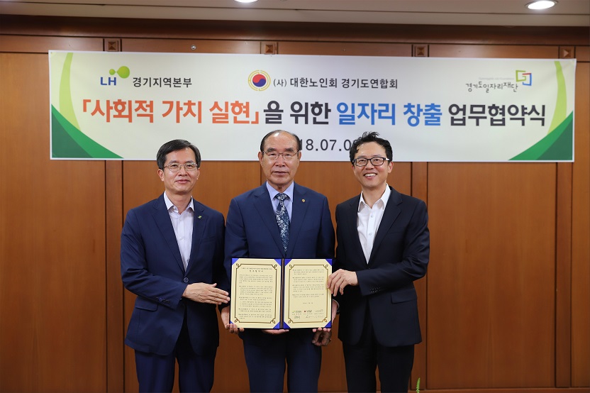 이날 LH경기지역본부 3층에서 열린 협약식에는 경기도일자리재단 김화수 대표이사와 LH 원명희 경기지역본부장, 대한노인회 이종한 경기도연합회장 등 관계자 20여 명이 참석했다.