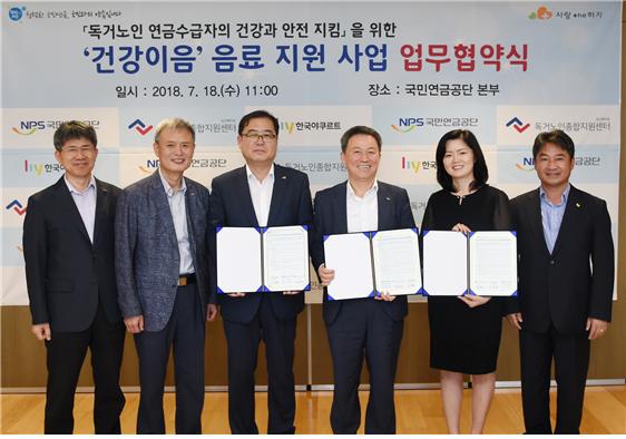 국민연금공단(이사장 김성주)은 18일(수) 공단 본부(전주시 덕진구)에서「독거노인 연금수급자 ‘건강이음’ 음료 지원 사업」을 효과적으로 수행하기 위해 ㈜한국야쿠르트(대표이사 김병진), 독거노인종합지원센터(센터장 김현미)와 업무협약을 체결했다.