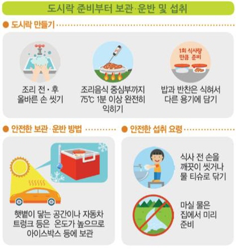 도시락 보관과 운반 요령은 ▲조리된 식품은 실온에서 2시간 이상 방치하지 않기 ▲가급적 아이스박스 등을 이용해 10℃ 이하에서 보관·운반 ▲햇볕이 닿는 공간이나 자동차 트렁크에 보관하지 않기 등이다.