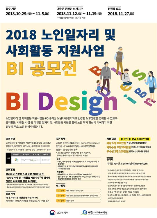 공모주제는 ‘활기차고 건강한 노후생활 지원’이라는 ‘노인일자리 및 사회활동 지원사업’의 취지와 친근한 이미지를 담은 BI 디자인이다. 시그니쳐, 심벌마크, 로고타입, 슬로건 등 4가지 BI 디자인을 공모한다.