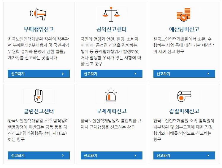 ‘갑질피해신고’는 한국노인인력개발원 홈페이지(kordi.or.kr) ‘kordi신고센터’를 통하여 접수 가능하며, 주요 내용은 갑질 상담 및 신고 접수와 조사 등이다. 신고 관련 상세 내용은 한국노인인력개발원 전략기획부(031-8035-7522)로 문의하면 된다. 신고자와 신고 내용에 대한 비밀은 절대적으로 보장하며, 갑질신고 온라인 페이지는 비공개로 운영된다.