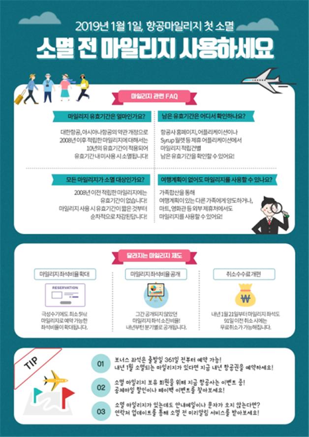 ‘19년 1월 1일, 유효기간 10년이 만료되는 항공마일리지의 첫 소멸이 시작되면서 국토교통부(장관 김현미)는 마일리지를 보유한 소비자들에게 항공마일리지를 적극적으로 사용할 것을 당부했다.