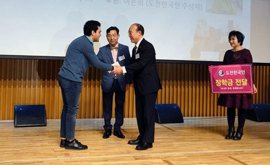 외국 유학생 나짐 미카일리(Nazim Mikayilli)에게 장학금을 전달하고 있는 이돈희 본지 수석부사장.