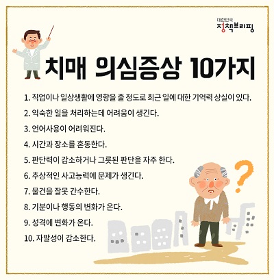 치매의 인지기능 증상과 정신행동증상 등을 두루 포함해 ‘치매를 의심할 수 있는 증상 10가지’를 알아본다. 하지만 이 증상이 모두 있어야 치매인 것은 아니며, 이 증상이 없어도 치매일 수 있다. 치매의 증상은 개인차가 있고, 원인과 경과, 주변 상황에 따라 다양하게 나타나므로, 정확한 치매의 진단은 전문가와 상담을 통해 확인하도록 한다.
