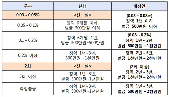 경찰청은 6월 25일부터 시행하는 ‘개정 도로교통법’에 혈중알코올농도 0.03∼0.05% 구간을 신설, 이에 해당하는 경우 징역 1년 이하·벌금 500만원 이하를 부과한다고 밝혔다.  혈중알코올농도 0.03%는 평균적으로 소주 한두 잔 정도 마셨을 때 나타나는 수치다.