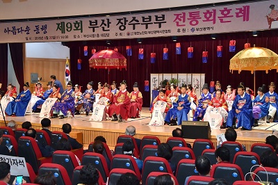 부산시연합회(회장 문우택) 는 지난달 27일 부산시청 대강당에서 혼인 예순 돌을 맞은 장수부부를 축하하는 ‘장수부부의 회혼례(回婚禮)’를 개최했다.