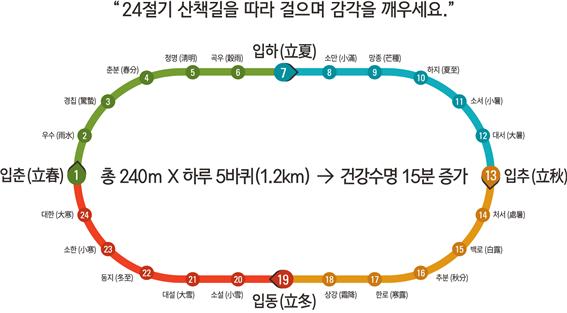 시는 ‘100세 정원’ 총 240m를 하루 5바퀴(1.2km) 산책하면 건강수명이 15분 증가하는 효과가 있다고 밝혔다.