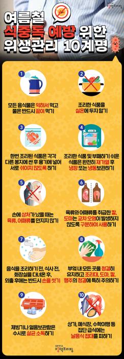 여름철 식중독 예방을 위해서는 아래 내용의 위생관리 10계명을 숙지하고 잘 실천하여 건강한 여름을 보내도록 하자.