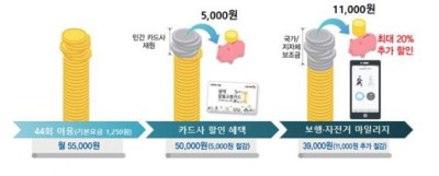* 마일리지 보상기준: 대중교통 최소 월 15회 이상 이용~ 최대 월 44회 이용, 최대 11,000원 적립