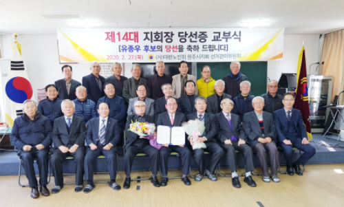 재선에 성공한 유종우 지회장은 당선증 교부식에서 앞으로 4년간 내 집처럼 행복한 경로당 환경조성 등 노인복지 증진을 위하여 혼신의 노력을 다할 것을 약속하였다.