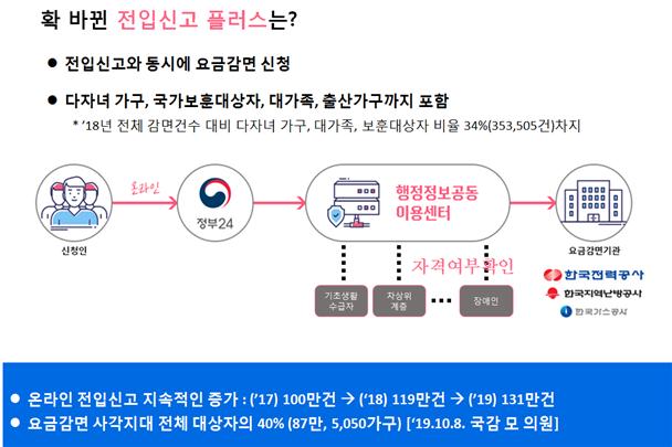 ‘전입신고 플러스 원스톱 서비스’는 사회적 배려대상자가 온라인 전입신고를 하면서 전기요금, 텔레비전 수신료, 지역난방비, 도시가스 요금 등의 감면을 한 번에 신청할 수 있는 서비스다. 지금까지는 이사할 때마다 전입신고와는 별개로 요금감면 신청도 각각 따로 신청해야 하는 불편함이 있었다.