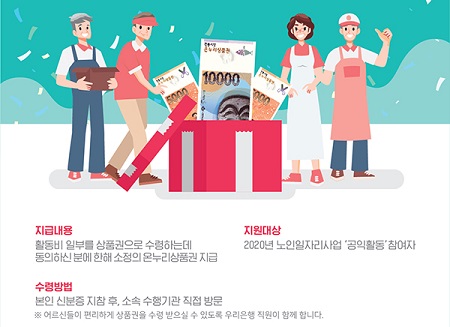 특히 우리은행은 사회공헌활동의 하나로 노인일자리 상품권 지급을 지원하기로 하고, 노인일자리전담기관인 한국노인인력개발원과 업무협약 체결 등 관련 절차를 진행해왔다. 아울러 일선 현장의 업무 부담 완화, 참여자의 편의성 증대를 위해 전국의 우리은행 지점과 수행기관을 연결해 은행직원이 직접 현장에 방문해 온누리상품권 지급을 지원하게 된다.