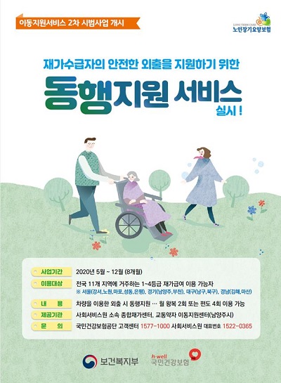 장기요양 이동지원서비스 시범사업은 2019년부터 국민건강보험공단 주관으로 실시하는 사업으로, 초고령 사회를 앞두고 재가수급권자의 지역사회 거주를 지원하고자 병원진료 등 외출 시 차량연계 및 동행지원 등 수급자의 안전한 이동을 지원하는 사업이다.