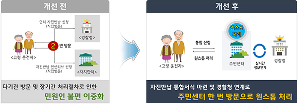 행정안전부와 경찰청은 고령 운전자 운전면허 자진반납과 인센티브 지원신청을 주민센터에서 한 번에 할 수 있도록 원스톱 서비스를 구축한다고 지난 27일 밝혔다. 그동안 운전면허증을 반납하려면 경찰서나 운전면허시험장에 가서 면허증을 제출하고, 교통카드 등 인센티브 지원을 받기 위해 다시 지자체 행정관서를 방문해야 하는 불편이 있었다. 이에 많은 지자체에서 도입하고 있는 고령 운전자 운전면허 자진반납자 지원제도의 실효성을 높이고자 접근성이 좋은 주민센터를 통해 한 번에 처리할 수 있도록 한 것이다.