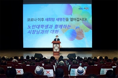 최기문 영천시장은 “노인대학생과의 대화를 통해 어르신들의 고충과 영천에 대한 애정을 다시 한번 느낄 수 있는 좋은 기회를 마련해줘서 감사드린다. 노인대학의 활성화와 영천시 어르신복지의 발전방안에 대한 지혜를 모으는데 협조해주실 것을 당부드리며, 종식되지 않은 코로나19로 인하여 답답하시겠지만 생활수칙을 지켜서 항상 건강하게 영천을 지켜 주실 것을 당부드린다”고 전했다.
