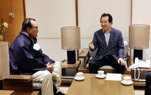 | 김호일 대한노인회장(왼쪽)이 정세균 국무총리와 대담을 하고 있다. |