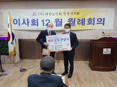 강동구지회(지회장 김병운)는 지난 3일 강동구지회 3층 강당에서 효인성문화원(원장 김재성)과 행복 물품 전달식을 가졌다.