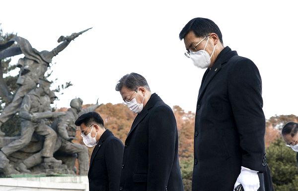 문 대통령은 현충탑 앞에서 헌화 및 분향과 묵념을 한 뒤 방명록에 ‘국민의 일상을 되찾고 선도국가로 도약하겠습니다’고 적고 서명했다.