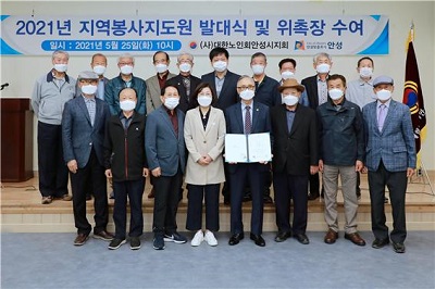 지역봉사지도원은 고령화 시대 사회적 경험과 신망이 두터운 지역 어르신을 지도원으로 위촉하여 노인 권익신장과 복지증진, 봉사활동 촉진 등 지역발전의 견인차 역할을 수행하게 하는 사업으로, 안성시는 15개 읍면동 분회 및 470개 마을 경로당별로 1명씩 총 485명의 지역봉사지도원을 위촉하여 운영한다. 참석자 외에 코로나19로 인해 마을경로당별 470명에게는 각 읍면동 분회별로 위촉장을 전달할 예정이다.