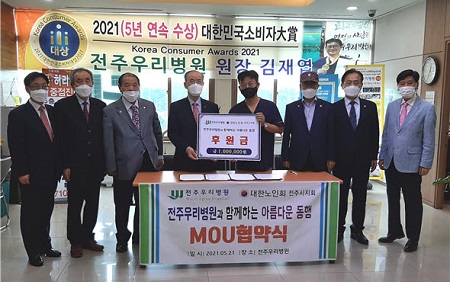 김재엽 우리병원장은 전주시 어르신들의 건강증진과 노인복지증진을 위해 앞장서는 전주시지회의 발전을 위해 지회발전기금 100만 원을 기부했다.