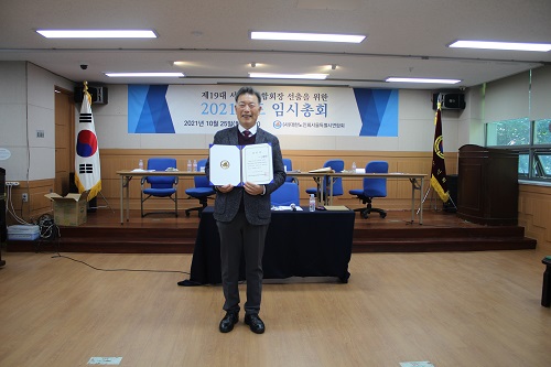 당선증을 들고 환하게 웃고 있는 고광선 서울시연합회 신임회장