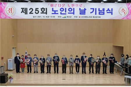 예산군지회(지회장 박상목)는 지난 8일 예산군노인종합복지관 1층 금강홀에서 제25회 노인의 날 기념식을 개최했다. 이날 행사는 어르신들의 노고에 감사를 표하는 사회적 분위기를 조성하기 위해 마련됐으며, 노인복지 발전에 기여한 유공자 32명에게 표창패가 수여됐다.