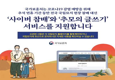 정부는 추석 연휴 기간(18∼22일)에 현충원, 호국원 등 전국 11개 국립묘지는 현장 참배 대신에 ‘온라인 참배’로 대체 운영된다고 밝혔다.  이번 조치는 추석 연휴 기간 국립묘지 참배객 집중에 따른 코로나19 확산 방지 및 참배객 안전을 위한 불가피한 결정이라고 보훈처는 설명했다.