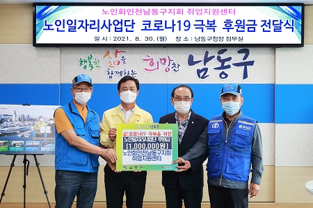 남동구지회(지회장 이창순) 노인 일자리 사업 ‘OK6070아파트택배사업단’은 코로나19 극복을 위한 후원금 100만 원을 남동구에 전달했다.