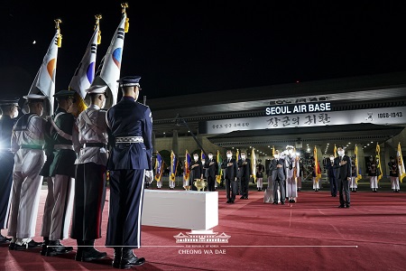홍 장군의 유해는 군악대 성악병의 독창 ‘올드 랭 사인’과 함께 의장대의 호위 속에 로더(리프트)를 통해 특별수송기에서 하기됐다.