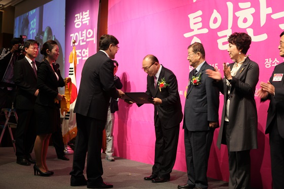 | 제19회 노인의 날 기념식에서 이심 대한노인회 중앙회장이 국민훈장 무궁화장을 받고 있다. |