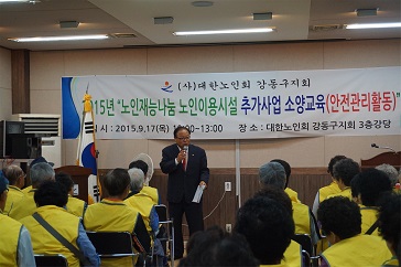 이러한 조치를 취하는 시설안전교육을 지난 4월에 이어 추가사업에 지난달 15일과 17일 강동구노인회 3층 강당에서 노인재능나눔활동지원 참여자 100여 명이 참여한 가운데 노인시설안전교육으로 진창은 길동119 안전센터장이 화재 시 대피요령, 응급 시 대피요령 등 설명과 실습을 보여드리고 설명을 해주었다. 그리고 노인안전 및 건강 특히, 노인들이 취약한 척추에 대한 교육으로 달려라병원 이성우 원장이 교육을 하였고, 소양교육으로 강동구노인회 고문이고 서울시 사회복지협의회 의장인 황용규 사회복지교수가 노인으로서 갖추어야 할 소양과 국제정세 및 젊은이들에게 대하는 노인들의 자세로 소양교육을 하고 안전관리 활동교육으로 정용권 대한노인회 서울특별시연합회 부회장 겸 강동구지회장이 각 시설을 다니면서 전기, 가스, 수도, 소화기 등을 점검하는 방법 등을 교육 실시했다.