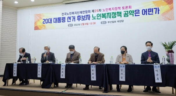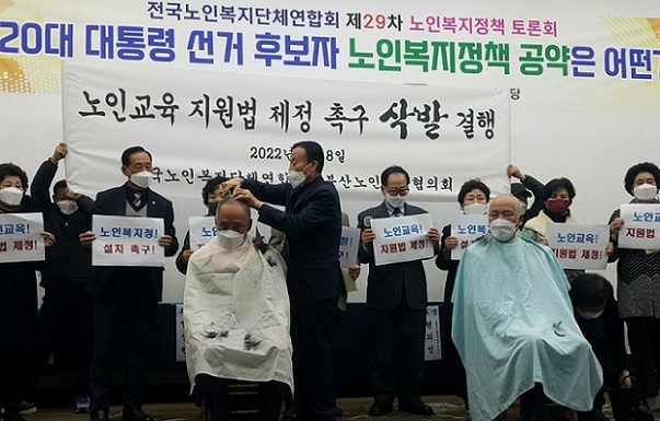 전국노인복지단체연합회(회장 임춘식)가 주관하고 부산노인복지단체연합회(회장 김용식)와 부산노인대학협의회(공동회장 김만률, 홍종희) 주최, 보건복지부(장관 권덕철)와 사)한국언론사협회(회장 주동담) 후원으로 ‘제29차 노인복지정책토론회’가 지난 8일 부산시 동구 부산일보 대강당에서 ‘20대 대통령 선거 후보자 노인복지정책 공약은 어떤가’라는 주제로 개최되었다. 이날 토론회를 마치고 토론회장에서 노인복지단체 관계자들이 노인교육 지원법 제정 촉구를 강력하게 요청하는 삭발을 결행하여 노인정책의 중요성을 대내외에 알렸다.