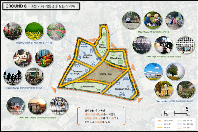 최우수상은 대상지를 여섯 개의 공간으로 구획하고 여섯가지 키워드에 관한 공간실험과 관찰을 통한 공간 활용의 가능성을 제안한 <그라운드6:여섯가지 가능성의 실험과 기록>(박영석)이 선정됐다. 현재 송현동 부지의 상황과 주변의 장소성, 역사성을 고려한 참신한 작품이며 임시활용기간 동안 공간의 활용과 쓰임새를 바탕으로 이 장소의 미래상을 그려본다는 접근방법을 제시해 높은 점수를 받았다.