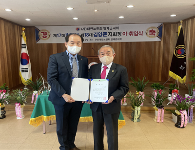 인제군지회는 지난 7일 인제군지회 강당에서 지회 임원과 이사진이 참석한 가운데 제18대 인제군지회장으로 당선된 김양준 지회장의 취임식을 개최하였다.  행사는 제17대 박기선과 제18대 김양준 지회장의 이.취임식으로 진행하였다.