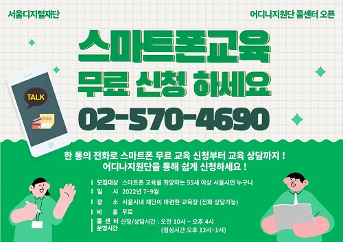 7∼9월까지, 어디나지원단 콜센터(02-570-4690)로 1:1 스마트폰 교육 신청 가능
