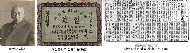 `강제하·이웅해·백남준·최명수 선생' 선정대한통의부 발족 기사(1923.3.10).〈사진 제공 : 국가보훈처〉최명수 지사대한통의부 발행 어음(1원).대한통의부 훈련광경.